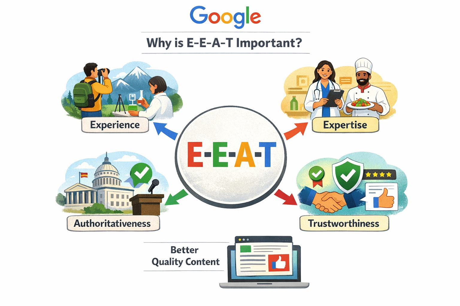 Learn how E-E-A-T (Experience, Expertise, Authoritativeness, Trustworthiness) influences Google's content quality evaluation and how to enhance it for better SEO performance.