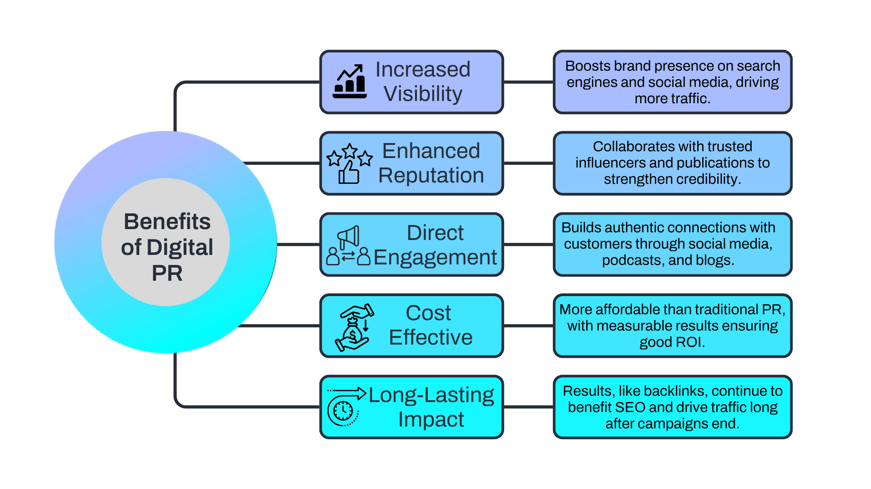 - Digital PR offers businesses the opportunity to engage directly with their audience through social media, podcasts, and blogs. This direct engagement helps create stronger, more authentic relationships with customers, making them more likely to trust and support your brand.