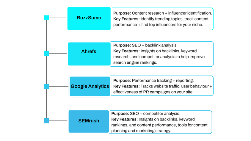 In summary, BuzzSumo helps with content research and influencer identification, while Ahrefs and SEMrush focus on SEO and competitor analysis, providing insights to improve rankings and content strategy. Google Analytics tracks website performance, helping you assess the effectiveness of your PR efforts and make informed decisions.