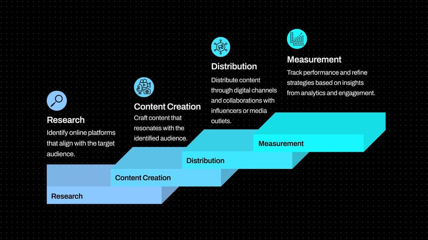 - Once the right platforms are identified, content is crafted and distributed across digital channels, including social media and online publications. Collaborations with influencers or media outlets help amplify the message.